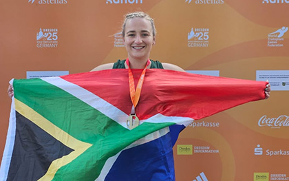 Recently, Michelle represented South Africa at the World Transplant Games in Dresden, Germany, joining 65 fellow South African transplant recipients. Competing on an international stage, Michelle brought home an impressive haul of medals. Gold in javelin and bronze in shot put and ball throw.